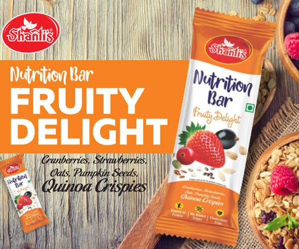 Here at Shanti’s we believe in providing you Natural Nutrition and Health with Each and every product by sourcing the finest ingredients around the world, innovation is what we do best with our food processing technology and helping community to form healthy eating habits that taste good. Fruity delight contains Fruits and Seeds like Black Currents, Cranberries, Raising, Watermelon seeds, Pumpkin Seeds, Amaranth Seeds, Chia Seeds, Flax Seeds and Sesame Seeds. It also Contains Goodness of Oats, Rice Crispy and Quinoa Crisp etc. It is no added Sugar Bar and naturally Cholesterol free. Added Vitamins and Dietary Fibers gives extra toward your Health. You have approx. 4gm of Protein from each Fruity Delight Bar.