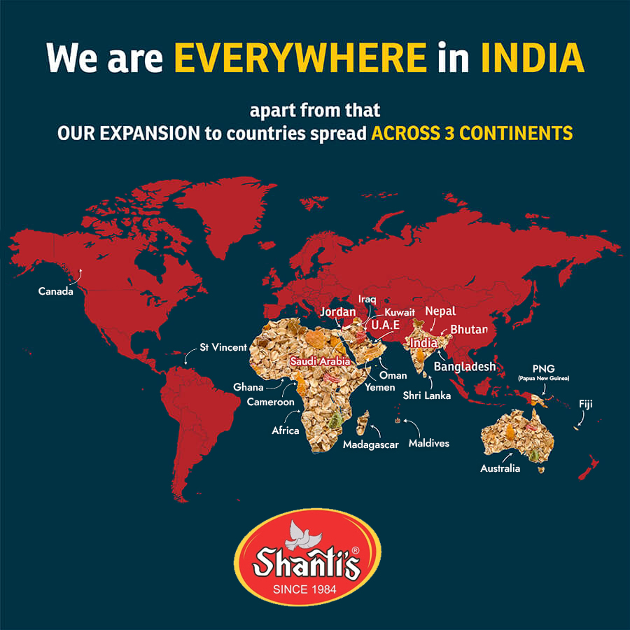 At Shanti’s, we believe in spreading the breakfast revolution, one country at a time. We are eager to export our range of healthy breakfast cereals and rice crispies to every corner of the world. We are gradually expanding our presence and are currently present in 3 continents. Help us bring health and happiness to your country.
